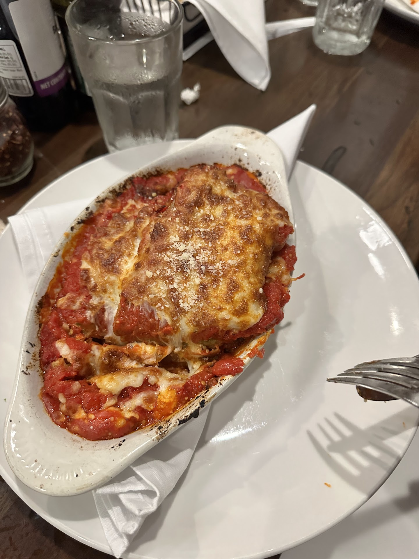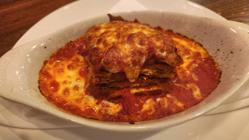 As for my entrée, I was very disappointed. The eggplant, sliced extremely thin, was heavily breaded that I couldn't even taste or feel any texture of the eggplant. I called it, "bread-plant lasagna." It had a mushy texture from the breadcrumbs. I couldn't taste any ricotta at all. After just a couple of bites, I gave up.