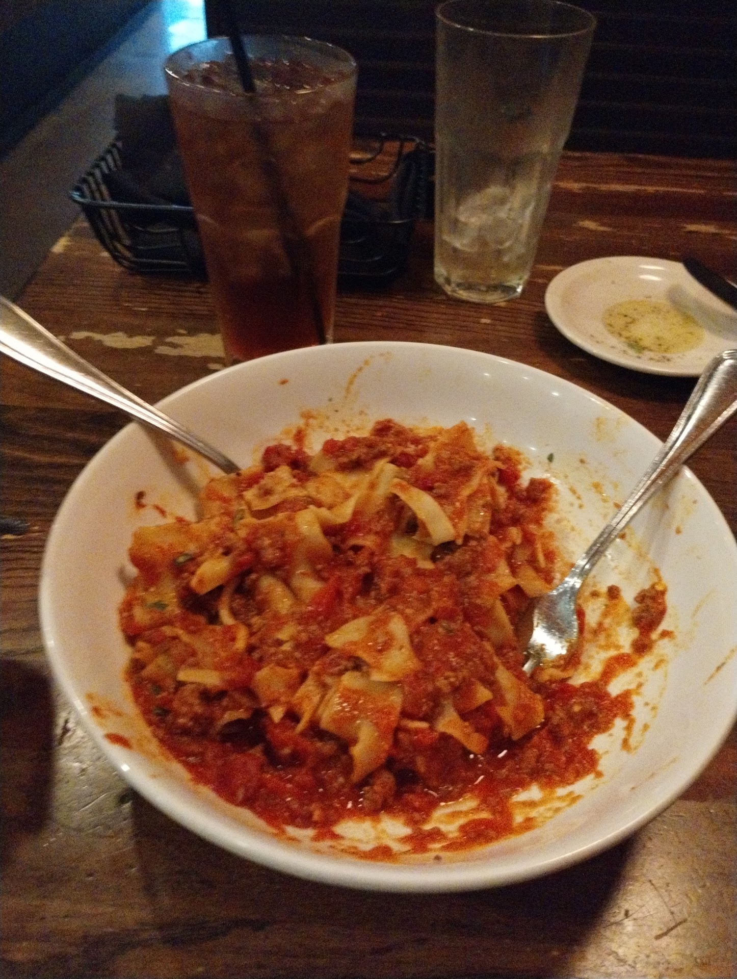 The second time we sat at the bar and waited for service for a bit as the bartender was busy cleaning the bar and tending to the servers drinks. Then when we asked for napkins all we got were bar napkins. No silverware.Also the spaghetti noodles were VERY undercooked so we had to send it back. No big deal it happens.