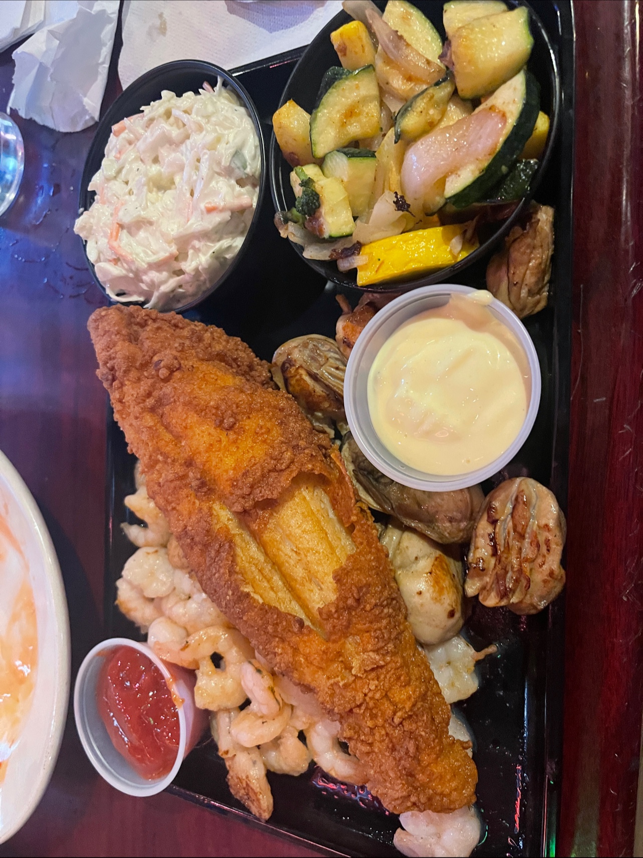 True Score- 4.09/5 Stars Definitely a great experience. Food was a bit pricy, but everything was great all around. TOP TIER service. Food: The food was great. I got a draft Voodoo Ranger Hazy IPA, and it was incredible. I started the night off with an order of the firecracker shrimp, and it was GREAT. The shrimp was so fresh, and the serving size was solid. I ordered the pick 3 seafood combo, with grilled shrimp, grilled oysters, and fried flounder. Again, shrimp was great, and so was the oysters. Both were very fresh. The flounder, however, was more breading than fish. I really should have gotten it grilled. Fried wasn’t really great. My girlfriend got the wings and they were also good. Definitely big, but I personally wouldn’t say they were jumbo. Better than 99% of wings, though. Price: Pricing was interesting. For fresh seafood, a high price is worth it. No complaints there. The wings were a bit pricy, and for 2 people, with an appetizer, and an alcoholic beverage for both, the total was 80ish dollars. A bit much. Service: This is the first 1 I have ever given for service I think. She was incredible, I wish I remembered her name. She was so personable, great with our 10 person party, and just felt like a friend. Food was fast, drinks were fast, perfect. Facilities: Facilities was a bit small. Very clean sports bar environment. Only thing I would worry about is parking in peak season. It was small, so I can see long waits in peak season. Satisfied?: Overall, satisfied. Great experience, food was good, pricing was the only meh. Seafood was good. NOTE: Star rating based on my own formula consisting of flavor, cost, facilities, service, and overall satisfaction. Reviews are subject to change based on future visits.