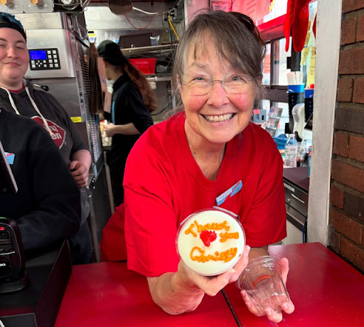 Much to my surprise, owner Ron and his amazing team at the DQ leapt at the opportunity. On extremely short notice, they welcomed my unruly family of nine, gifted my mom a t-shirt and name tag, let her work the Blizzard machine, made her a cupcake version of an ice cream cake... it's the happiest I've ever seen my mom. Memories and laughter for life. She legitimately couldn't sleep for the next week because she was so excited about the experience.