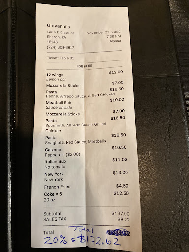 SIMPLY AWESOME!! GREAT FAMILY OWNED RESTAURANT THAT CREATES AMAZING & REAL ITALIAN FOOD!! I can not say enough great things about this establishment!! If you ask me, once the word gets our about this food, Giovanni's will be packed and a line out the door!! Even as it is, in the time we were there on a Wednesday night, there was a steady stream of take out pick ups and Grub Hub drivers picking up food. As to our food, we are originally from the Boston, MA & Providence, RI area that had enclaves called "Little Italy", where you ate real family Italian food!! I'm here to tell you, the Giovanni's family restaurant in Sharon delivered the food we remembered from back east!! They use family recipes that deliver real flavor using real and fresh ingredients that you can taste!! The funny part, in speaking with the son, it turns out the family moved to Sharon from the Boston area!!