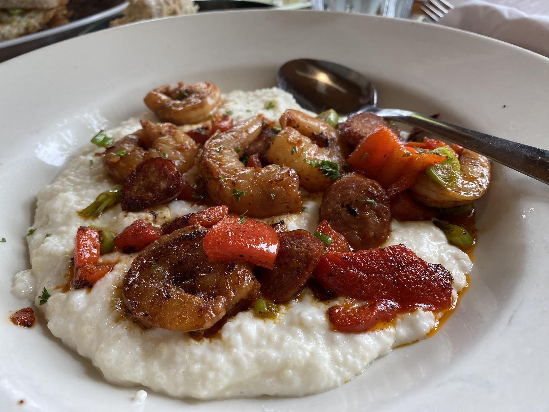 My husband and I stopped here for lunch on a Tuesday at the recommendation of one of his coworkers. The atmosphere is like an old cottage. Antique tables and lace curtains. Not great, but not horrible either (although I could have done without the dead fly trapped in the lace curtain next to our table). Almost all the tables were full. There's very little in the decor to dampen sound, so it was rather loud.