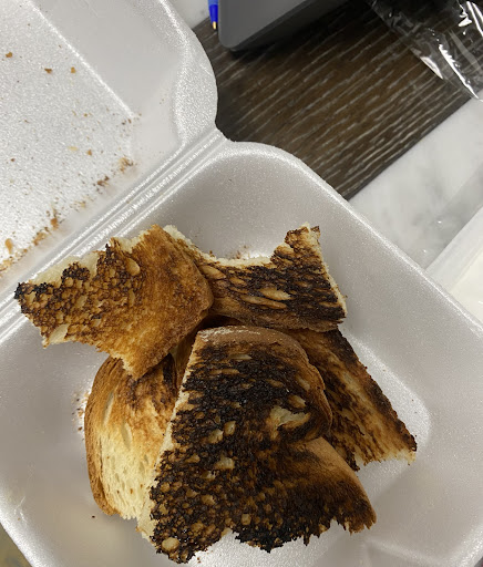 His was the actual steak dinner (and I know I shouldn't really expect steak from a place like this), so should have been bigger than my breakfast one. It was pure fat and smaller than mine. She took the whole plate back, so he couldn't even eat his side dishes. He just sat while me and our son ate. She came back and it was still a tiny well done price of steak. It was absolutely ridiculous. The manager did take it off but by that time, even the slow toddler was done eating. And even the kid didn't get what he asked for! He wanted the piggy pancakes and his meal came out with 3 giant pancakes that he wasn't going to be able to finish and he was sad it didn't look like the picture.