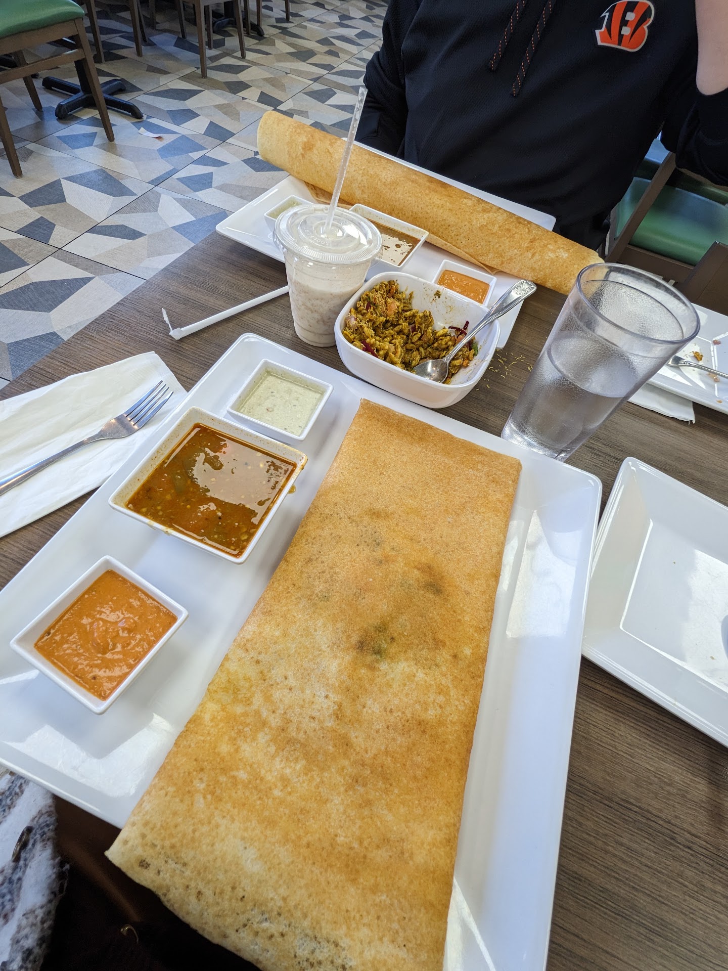 We ordered 1 Plain Dosa, 1 Paneer Tikka Masala, 2 Butter Rotis, 1 Chana Bhatura, 2 Mango lassies, and 1 Sweet Lassi. Made a very low spice level preference for the main entrees when we made the orders.