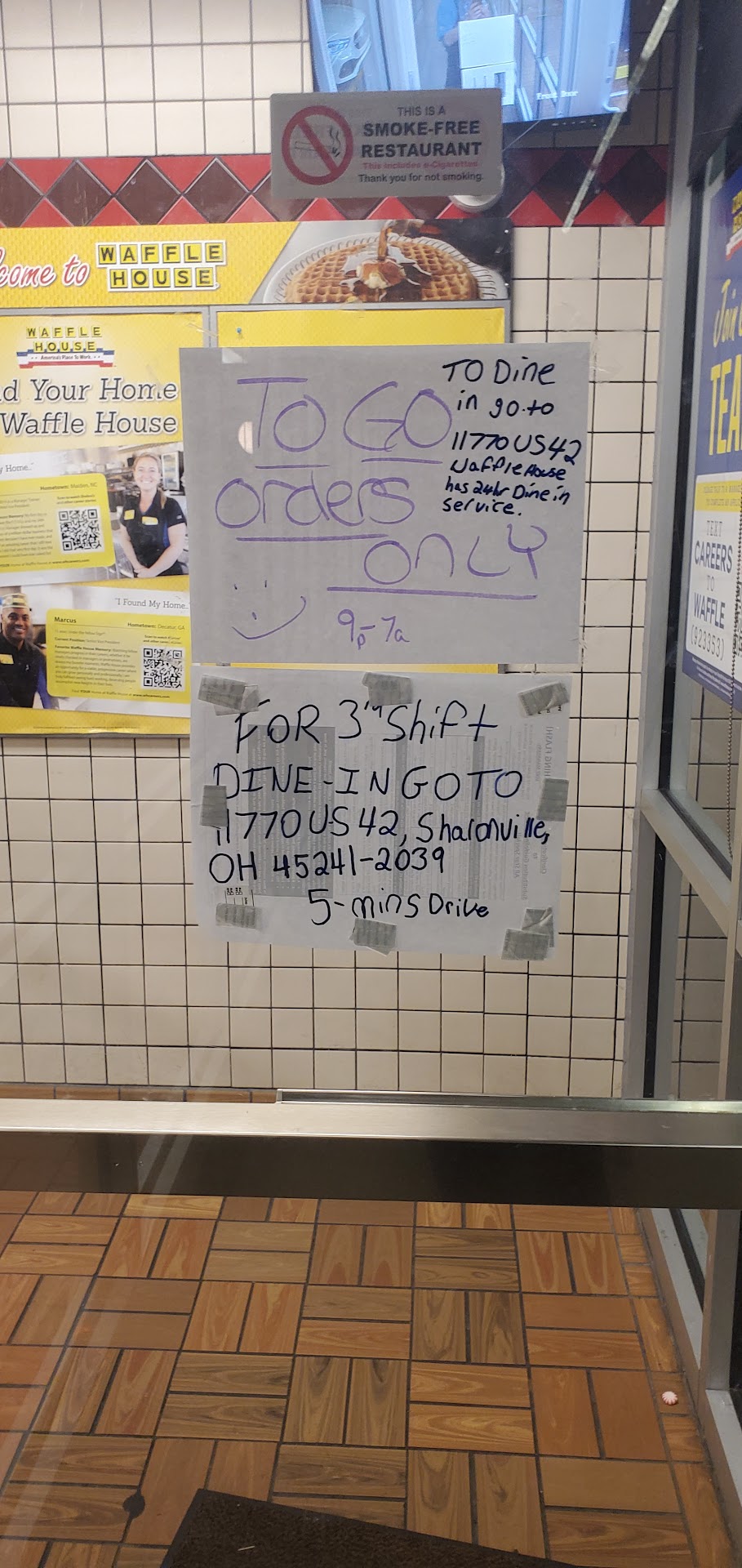 This location is currently only doing To-Go orders for their 3rd shift hours (9pm-7am) which is a policy being enforced by Waffle House Corprate (Midwest Waffles Incorporated)they are doing so in preparation for having a window installed that you will be able to order from instead of going inside.