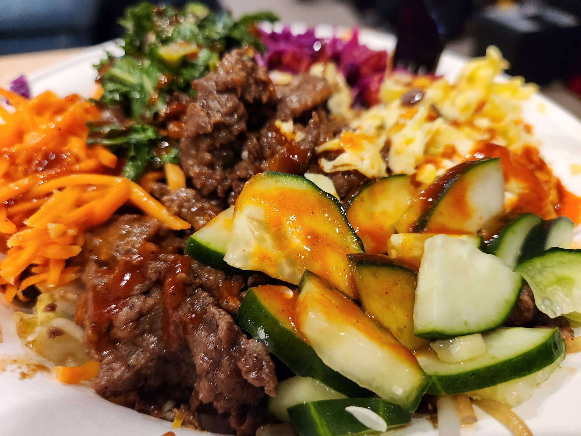 BIBIBOP is known for their healthy, gluten-free menu, but don't let that scare you away, there's plenty of flavor here! They're set up similar to Chipotle, where you build your order through a line. There's no table service here, just order, and seat yourself. All meals are bowls. First, you pick your base of rice, purple rice (you should try it, if you haven't), sweet-potato noodles (sweet-potato is gluten-free), and/or salad. Continue to pick the rest of your toppings, you can get as many different toppings as you like, though there are some toppings that may cost extra like Pineapple, or Avocado. Lastly, you will choose your protein; beef, korean beef, chicken, spicy chicken, or tofu.