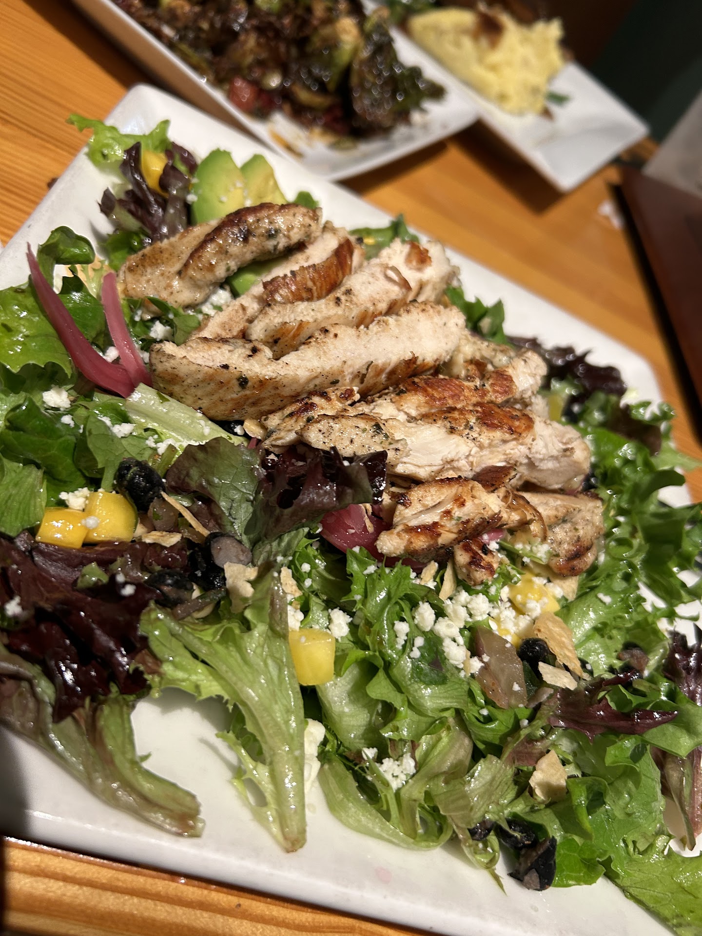 Now, the most important part, the food! Between the three of us, we all ordered from the Restaurant Week menu and got: 2 Cuc-Cosmo and a Rosemary Maple Sour for our 1st course (wanted the Winter Lager but they were out). Gumbo, Mini Seafood Dip, Brussels Sprouts for our 2nd Course. Pork Chops, Beef Short-rib Ravioli, and the Hazelnut Salmon Salad for Course 3. And then a Chocolate Torte and 2 Carrot Cakes (wanted to also get the Lemon Drop Cake but they ran out) for Course 4. The cocktails were delicious but in my opinion, too sweet! The Gumbo was very flavorful and warming on this cold evening. The Brussels were perfectly seasoned and cooked to the right texture. And the Seafood Dip was legit and packed with seafood flavor. The entrees were stars themselves, with the ravioli being my favorite of the three but I do wish the portion was slightly bigger. The salad was decently sized as well but the actual salmon portion was minimal. Nothing crazy to say about the desserts besides that we demolished them and thought the carrot cake was extremely balanced. I didn't realize we could get whipped cream with our desserts until we had finished and saw the table next to us order it as such.