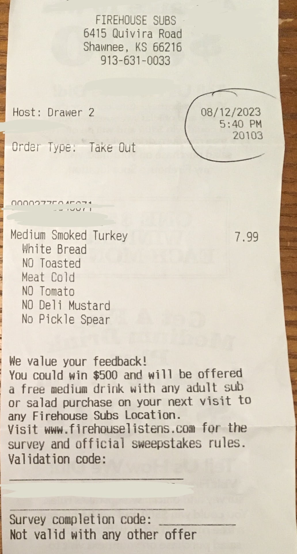 I will make one last trip to your door step to speak with the franchise owner. I will also be contacting the corporate office and airing my complaint. I will think twice before visiting this firehouse sub location or any other this day forth. I can go around the corner and get two slabs of ribs for this price & zero head aches too!
