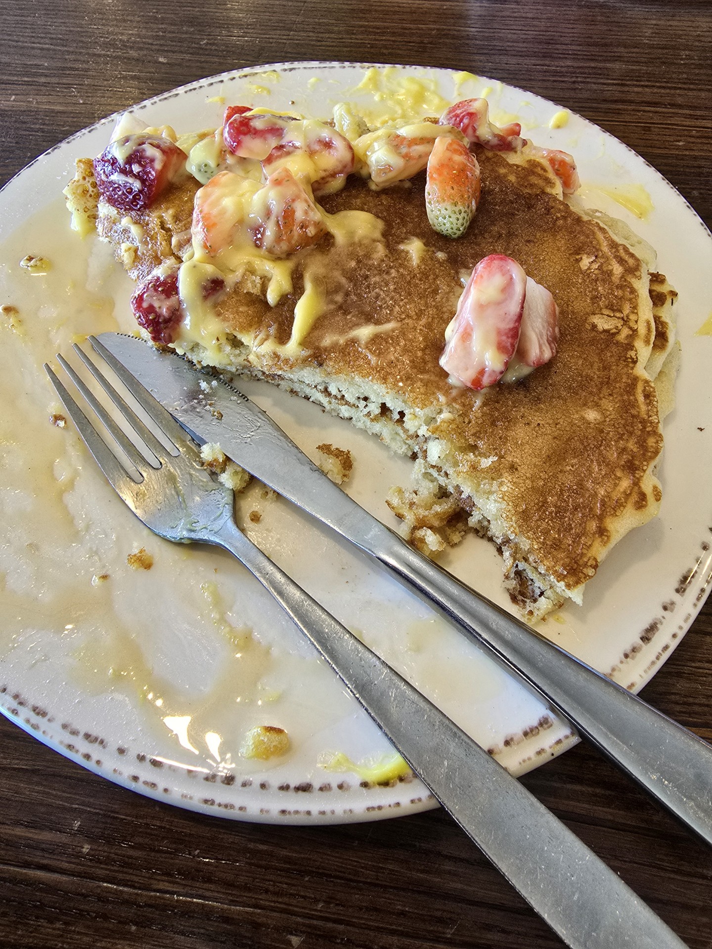 I ordered the French toast and it was not horrible it was cooked nicely. Though you can tell it's cooked on a grill where a lot of other items are cooked. Because I got a suprise every few bites. Hints of banana on one Bite, a feature in one of their specialty pancakes. Some avocado on another bite, which I will say they may be accidently onto somthing the flavor combo of this accidental combination was kinda amazing even if it was not intended. The berry compote that's a combination of blueberries, blackberries and dragonfruit maybe was far too sweet and i didn't take more than 1 Bite mixed in the French toast.