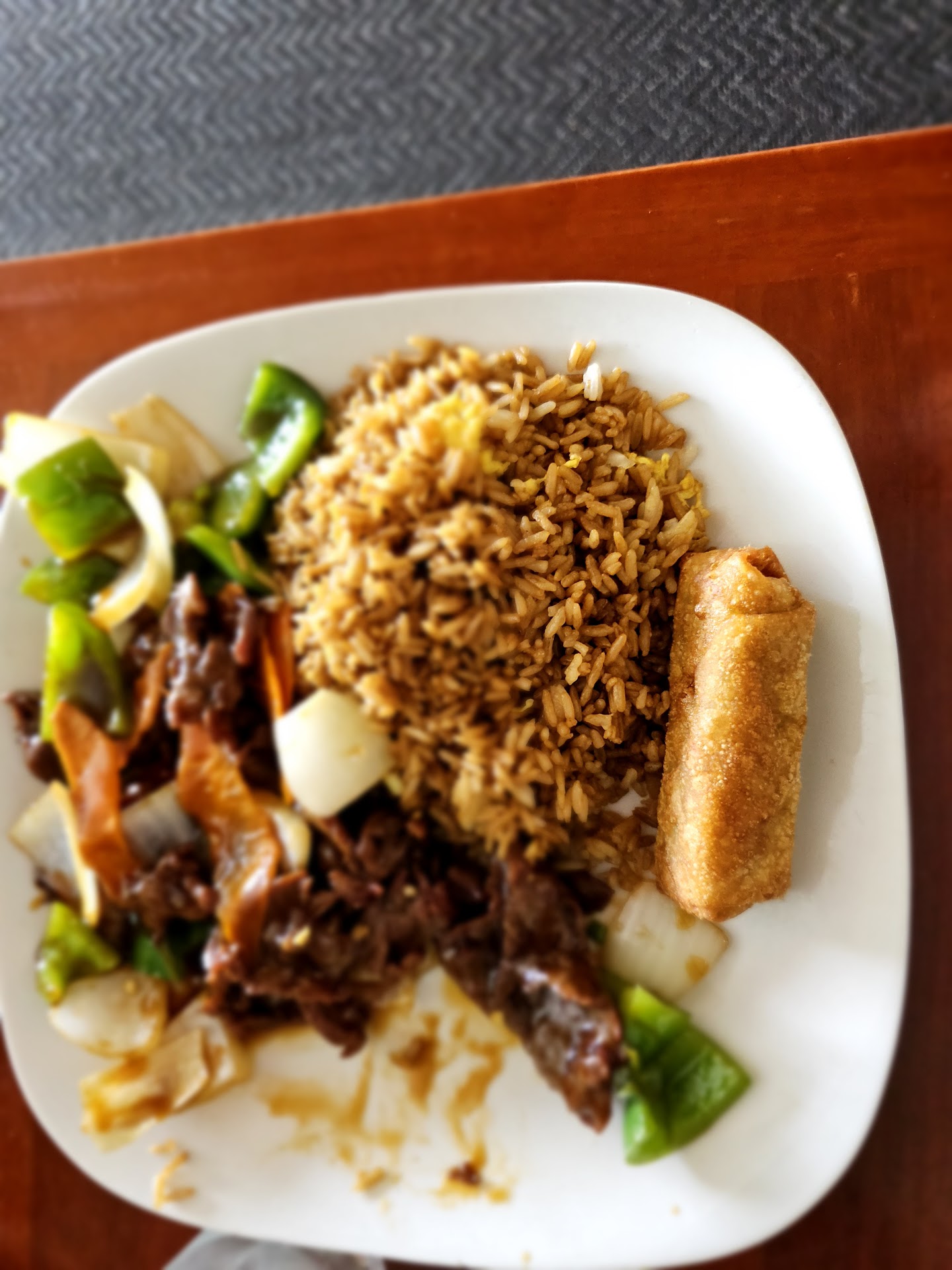 Wife had beef with green pepper, fried rice, egg roll and egg drop soup.