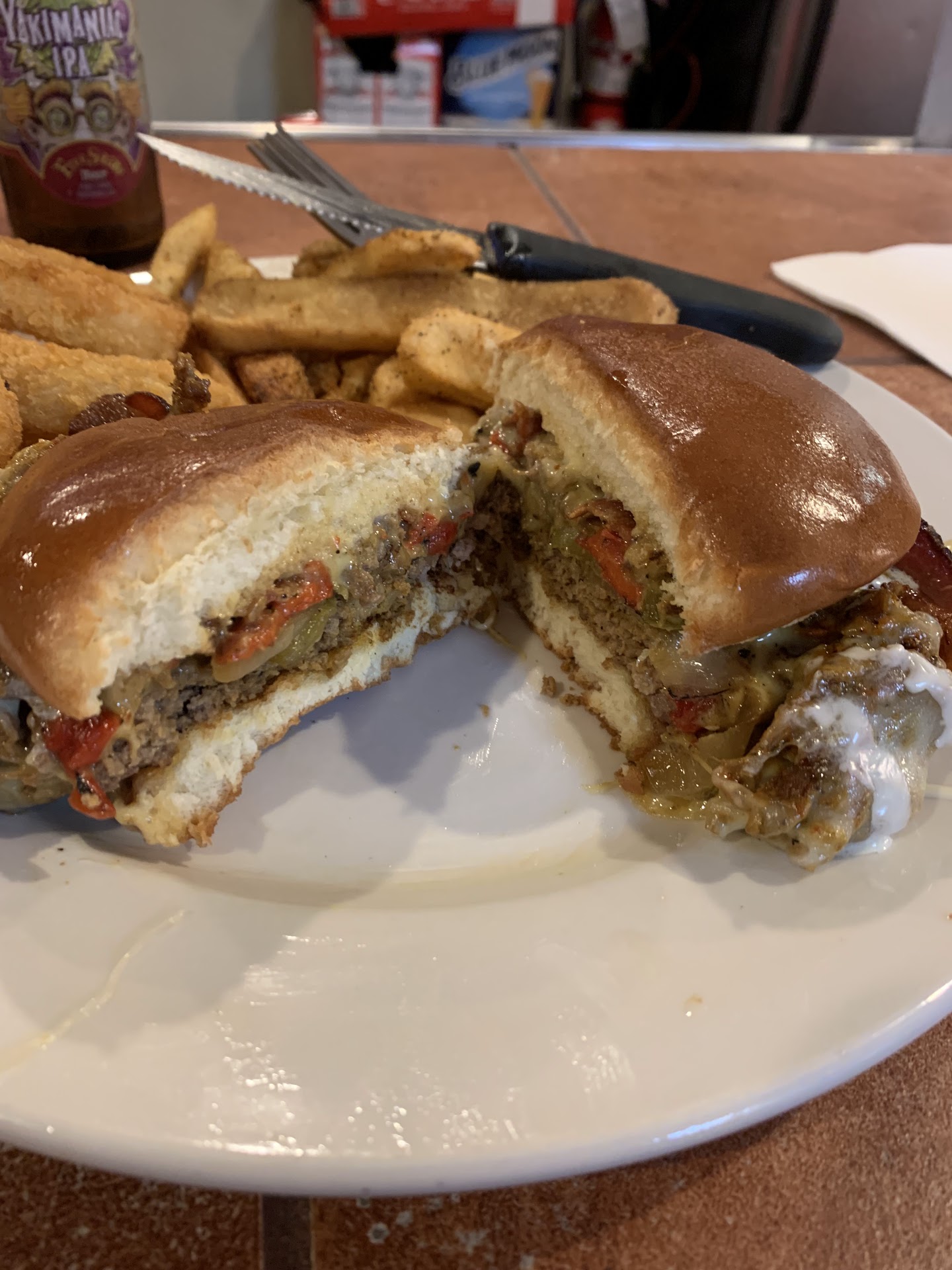 Tonight we got to try three different burgers-- all terrific! My personal favorite is the "Queso Fiesta", and my wife Danielle loved the "Old Dog Gouda". Generous portions, too!