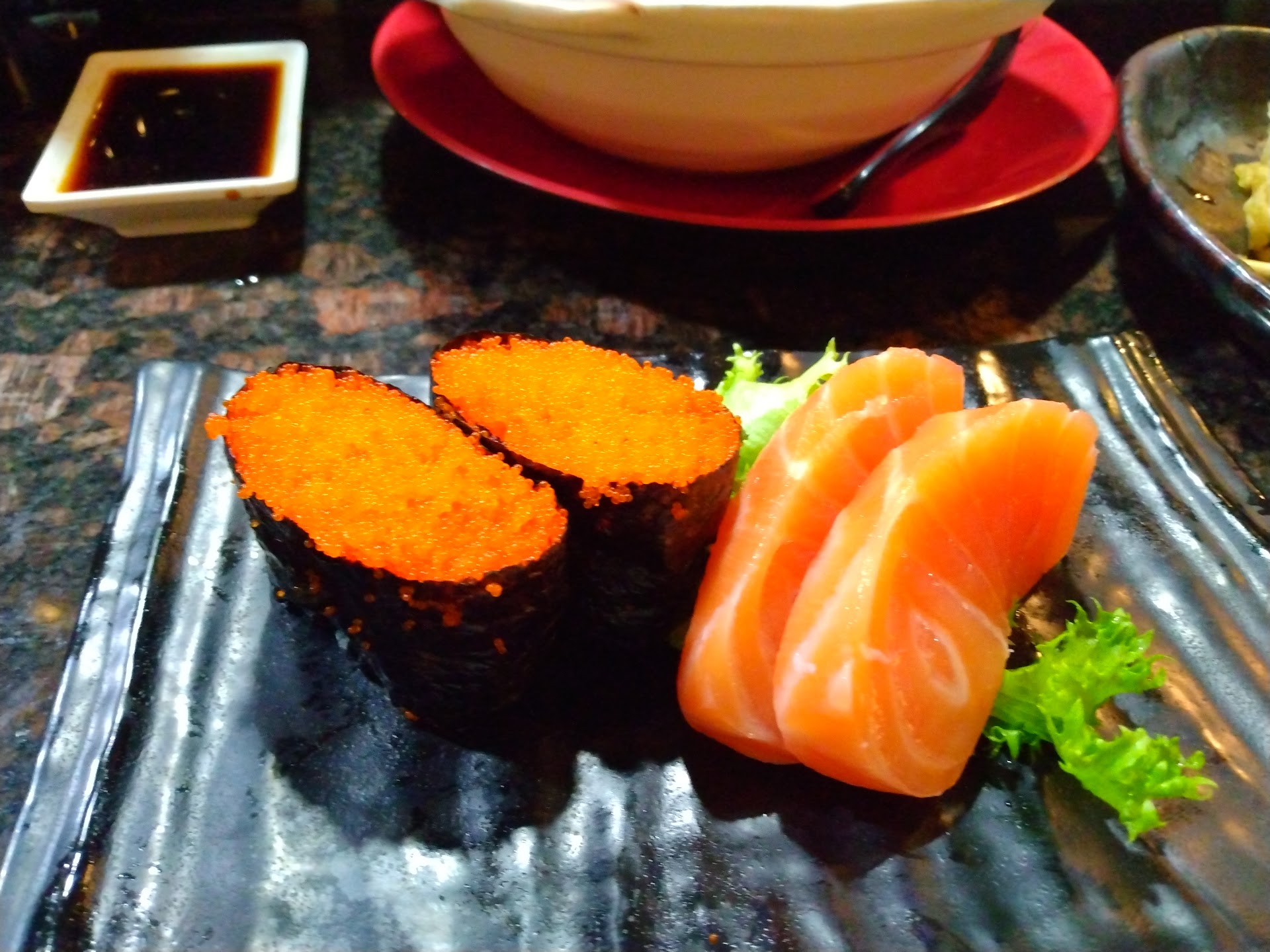 The salmon sashimi was passable, but a little soft and slippery and difficult to hold with chop sticks. Fresh, firm, and cool sashimi sticks to the chop sticks. My favourite sashimi, and the star of the meal was the roe.