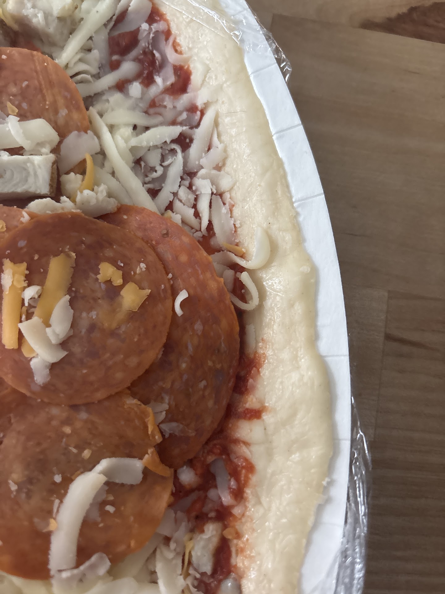 Take it home and add a thin layer of grated Asiago cheese, then top it with pinch after pinch of Scimeca's Italian sausage (get it at Hy-Vee), and pop that baby into your oven as instructed.