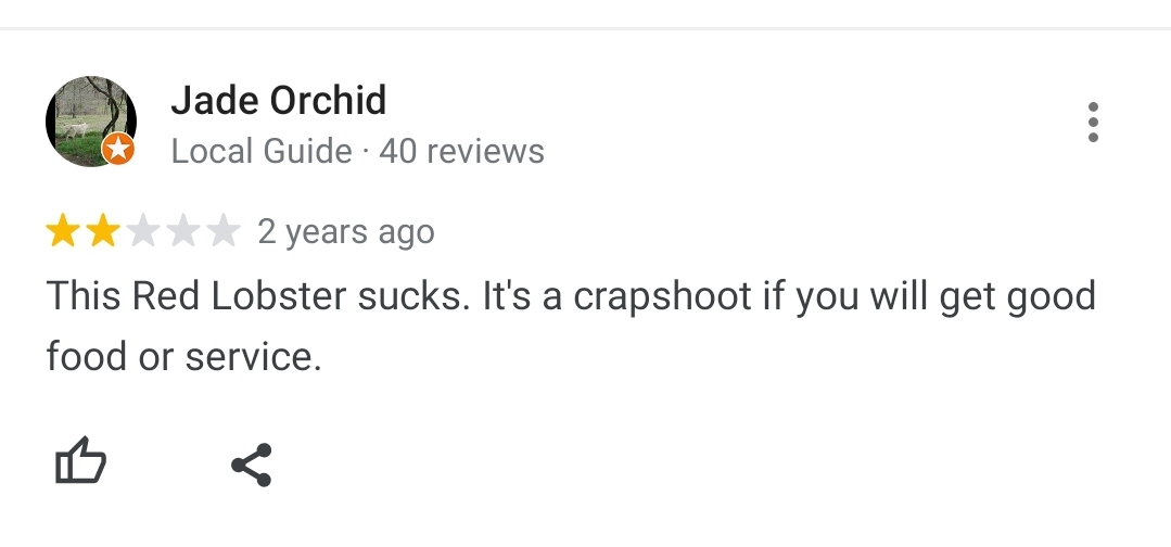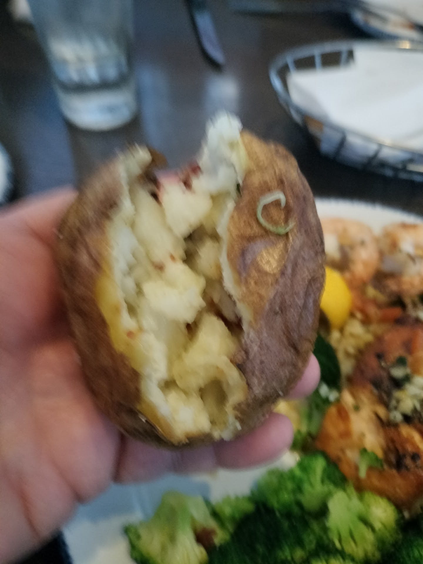 I really hate writing this, but I believe it's necessary for the sake of the company, I do not eat at Red lobster except on a very rare occasion, I'm spoiled because I'm used to eating seafood right on the Gulf Coast or fresh right off the boat, but we decided to go to Red lobster and I didn't want anything fried I wanted it grilled, so the plate that I ordered which was the only plate on the menu that was grilled was shrimp salmon and lobster small lobster tail salmon and a skewer of small shrimp, sides I ordered steamed broccoli and a baked potato, we ordered calamari which I knew it would end up being a big mistake and it was, I put the call amari in a to-go box and my wife asked me what was I going to do with it and I said I'm taking it to the ranch and I'm going to feed it to the catfish in the pond so at least I get something out of it, When my plate of food came first thing I did was took a bite of the broccoli and it was absolutely horrible and I spit that out Yes I did, the baked potato was so small it wasn't much bigger than a silver dollar and I put it right in the palm of my hand which I will post a picture of, the salmon was supposed to be grilled but it was grilled on a hot plate imagine that so it was hard on one side and the lobster which was split in the middle like it should be, and I tried the shrimp and it did not taste like grilled shrimp it didn't taste like shrimp hardly at all and the salmon steak did not taste like salmon and the lobster did not taste like lobster, what it all tasted like was garlic butter which was all over everything which totally dominated and killed any flavor of the seafood, I pulled the lobster out of the shell they did not bring any butter for me to dip the lobster tail in I presume that they figured I had enough garlic butter on it for everything that I didn't need it, the problem with the broccoli was it was freezer burned and I mean seriously freezer burned and you could not eat it so you can imagine what it tasted like, I know that they're trying to come out of bankruptcy from last year and I hate to have had to write this but if they don't get this right they're not going to come out of bankruptcy, and I hope they do I don't want to see any business go under but to serve a plate of food that's supposed to be grilled and it's so horrible you can't even eat it is sad, my plate look like a tornado went through it I was looking for something that I could eat I ate the potato I ate the two pieces of the lobster tail, and I ended up dipping it believe it or not in cocktail sauce or at least I think that's what it was in that little container, the waitress was very nice very polite attentive it was not her fault that she had to bring out that type of food. So with that being said I hope other people have a better experience than I did but I'm just telling the truth that's what it was and I will post a picture of the baked potato that I held in the palm...