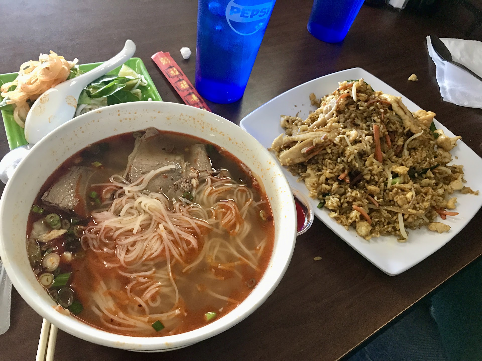Read moreReally like the PHO soups BEFORE the tornado hit Shawnee and closed it down. Have tried this twice since their reopening and the chicken pho is NOT the same. The chicken is greasy and inedible. The soup base has so much grease in it that it hardens on the spoon. This used to be the best soup but is not the same. The grill plate had very mushy rice that was in a tight ball and inedible. The normal flavor that used to be on the vegetables and the meat on the grill plate is not there. It was a homemade soy sauce that enhanced the overall dish. Still not impressed and sad it did not come back...