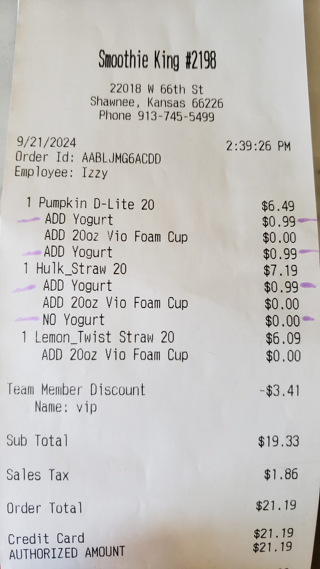 Read moreNever had a problem ordering on the app and picking up at this location, but when ordering in person I didn't like being upsold a yogurt add-in to my smoothie like it was supppsed to be part of it. And then not taking it off correctly on the order when I asked about it. There was a 15% discount already for the one year anniversary event, so I didn't complain, but I will stick to using the app if I want to visit this location in the future. The smoothies were great...