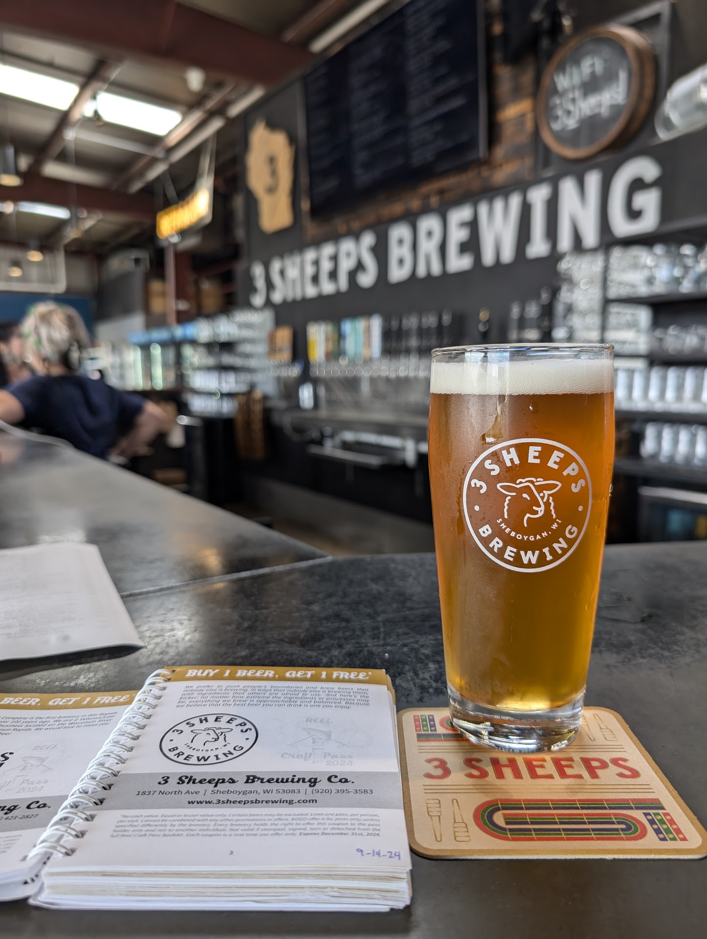 Read moreI stopped in at 3 Sheep's after a morning at Kohler Andre State Park around 11:15am on a Saturday. The Badgers were playing Alabama so a few people were watching the game on the far side of the seating area. Note this isn't a sports bar and they don't feature TV's, so don't come here expecting it to be your personal living room. I grabbed one of the 8 bar stools and was quickly served by two friendly bartenders. I sampled a few brews and ended up with a Saison, Oktoberfest, and the Armchair Quarterback. The first two were excellent, the third was fine.