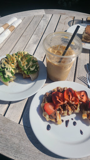 Read moreEven and Flo was suggested to us. We had no idea what to expect. We were greeted immediately by Sara. She was welcoming, friendly and helpful. They were busy but Sara took the time to explain their unique menu. She was wonderful. My wife got a savory croffle. Tasty and unique. I had delicious tomato basil soup. We purchased a cookie and cherry cheesecake muffin to go. That muffin was something else! The cookie was good but terribly overpriced. The star of the visit were the Refreshers we ordered. So satisfying. We wanted something different to drink. These were great. Mine was blueberry/lavender and hers was mango and something else. I will be getting another one of these soon. The atmosphere was very nice and lovely outdoor seating was available too. We wanted all their light fixtures. The other staff members were wonderful too. Fun visit. I really liked this place and will return but to me it is a light snack or treat place. If I wanted a meal I would go elsewhere. I gave five stars on all the sub categories but a four overall. Great place but a little pricey. For our two drinks, a snack, and sweet treat to go it was over forty dollars. Donât mind that, but not everyday. I am sure being on the pier and next to a resort makes their overhead high. Great place to visit with such...