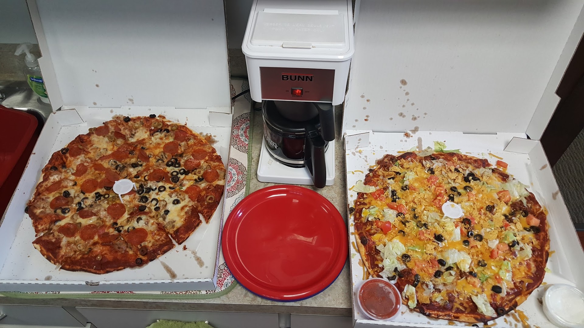 We liked it so much, we went back the next day for lunch, the gentleman recognized me from the night before and asked if I had been in there the previous night. I admitted I was and he said "so good you came back?" I was going to joke and say I actually came back for the girls in shorts and Faye's t-shirts, but yeah it's the pizza (not that the girls are bad, but I'm spoken for). This time we had the same but with olives, green peppers and onions on half the pizza (son doesn't like those). We also remembered (somewhat late) to ask for plates and napkins since we were taking it back to our room. The total for this pizza was just over $16.