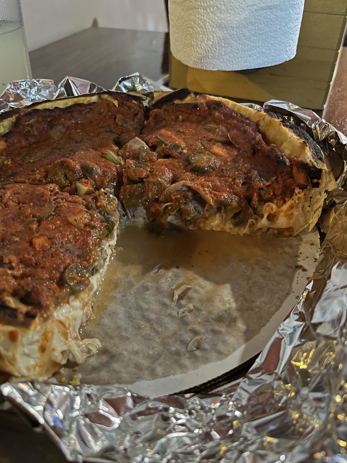 10” Deep Dish Taylor Street Pizza ($14.69 + $5.99 deep-dish surcharge): The pizza arrived at 6:47 PM. First Impressions: It looked unappealing. The menu’s photo looked promising , but what I received was burnt-red and sloppily assembled. • Upon lifting a slice, I noticed moisture pooling in the pan—unappetizing and a clear indicator of poor preparation. • The crust was a major disappointment. Thick and undercooked, it seemed rushed in the oven, likely at too high a temperature. It was unenjoyable and ultimately not worth eating. • The toppings were sparse and lacked flavor, except for the peppers, which gave their typical, spicy flavor. Even as a Wisconsinite, I found myself wishing there was less cheese.