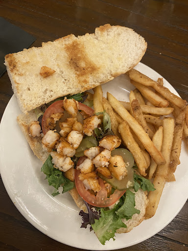 The problems came when the food landed, the chicken that my parents ordered was extremely overcooked, dry, and very hard. It came with some sort of sauce, it was tasty, but when we asked the waitress what it was she said she had no idea. My brothers medium rare steak, I could tell from across the table when it landed that it was definitely not medium rare. I was right, it was medium well at best. Half of it was cooked all the way through. He also said that it was dry, there was not a drop of juice on his plate when he was finished. I ordered a shrimp Po boy, no pickles add onions and when it came out it had pickles and no onions. Thatâs not too big of a deal, what was the alarming part is that there were two shrimp on there. And guess what? Overcooked and dry. A pattern is starting to emerge. I ordered a side salad as my side, I got that as well as french fries with the sandwich. I guess that was just oversight on someone elseâs part, I do appreciate them though because the fries were much better than the sandwich. Iâve included a picture of the sandwich. If there was a manager or someone walking around asking how things were, I wouldâve said something to them, but it wasnât apparent that anyone in charge was around. By the time the waitress came back, having not even known what the mystery chicken sauce was, I didnât feel like it would make any difference to say anything to her.