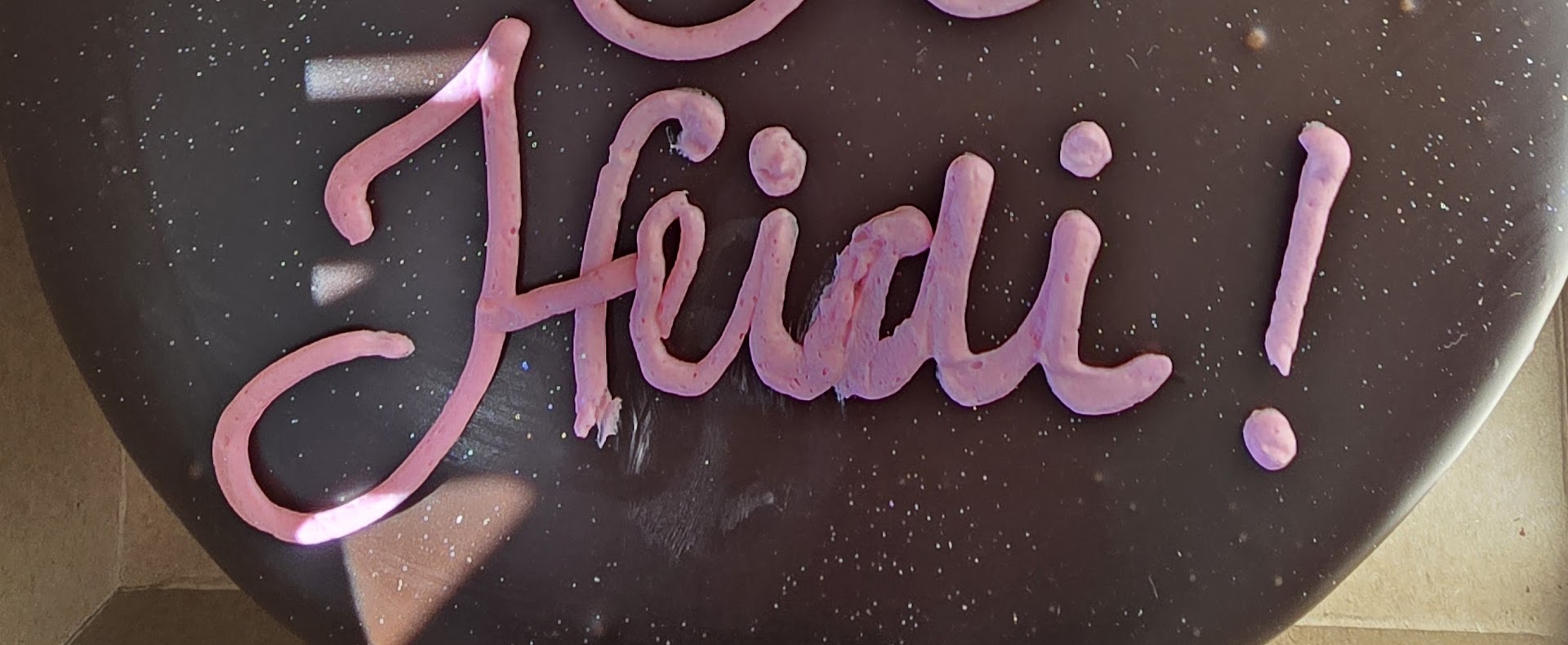 He said okay I'll go check and comes back out with my cake holding it in his hands without a box. He shows it to me and says that looks good? I looked at the writing and it looked like a child decorated it. What's more they spelled Heidi H E D I.