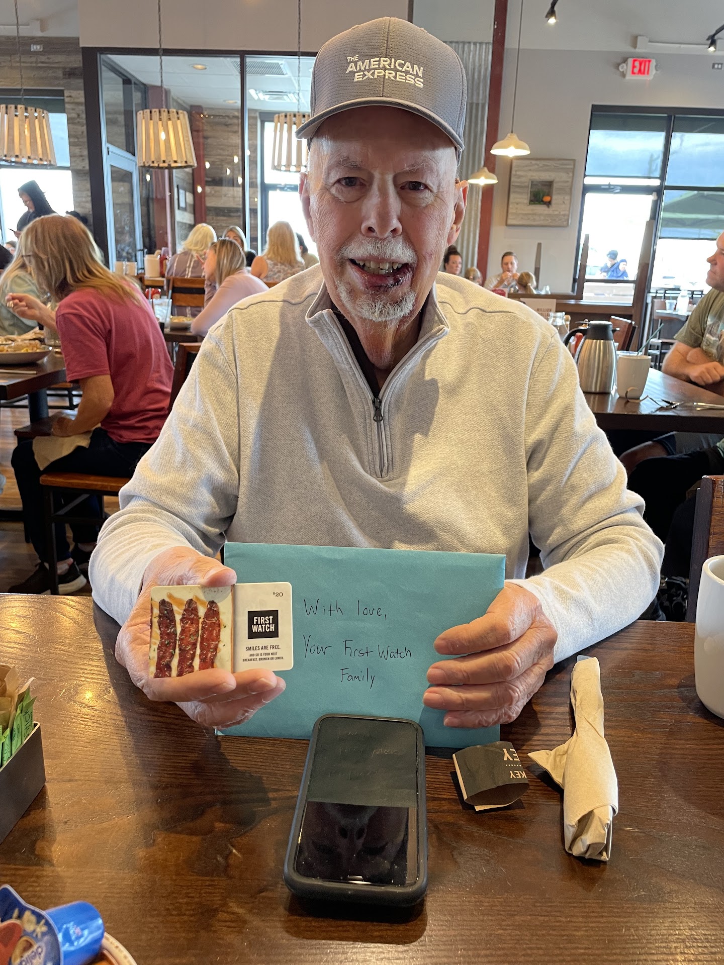 Yesterday was something truly special. My dad, who has been battling cancer, had part of his lip removed in surgery on Tuesday. It had been a tough couple of days, but by Sunday, he was eager to return to see his First Watch family—stitches and all! Not only did Carol and the crew greet him warmly and express how happy they were to see him, but they also surprised him with a card signed by the entire team and a $20 gift card. He was beaming and opened that card several times during our meal, smiling ear to ear.