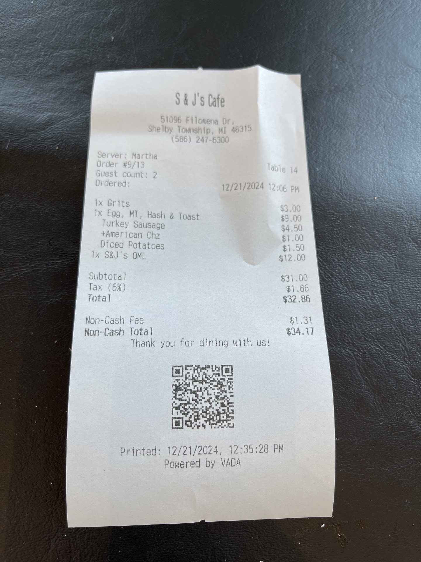 Upon getting our bill, I was shocked for the significant up charge for both of these items. Not once was this mentioned by the waitress that there was going to be an up charge for the turkey sausage or the diced potatoes. So I was definitely taken aback. Paying $16 for a very simple breakfast is diabolical and I would’ve rather gone elsewhere if I knew this was the situation. The QR code on the receipt doesn’t work as I thought this was mobile pay. We went up to the register to pay and I asked her. I didn’t realize there was an up charge and she didn’t apologize. I don’t blame her because she is probably a teenager, but this needs to be communicated. I could’ve gone up the street to a different brunch place and gotten more food for that amount of money. Needless to say, we most likely will not be back.