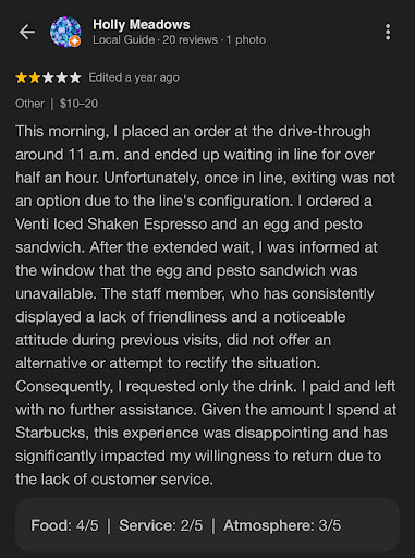 I completely understand that Starbucks gets very busy and that mobile orders add to the volume, but the dismissive and rude attitude I received made the experience much worse. Spending this much money on coffee should at least come with basic customer service. Waiting 10–20 minutes for one drink during a busy morning is already tough, but being treated poorly on top of that makes me question if it’s worth coming back.
