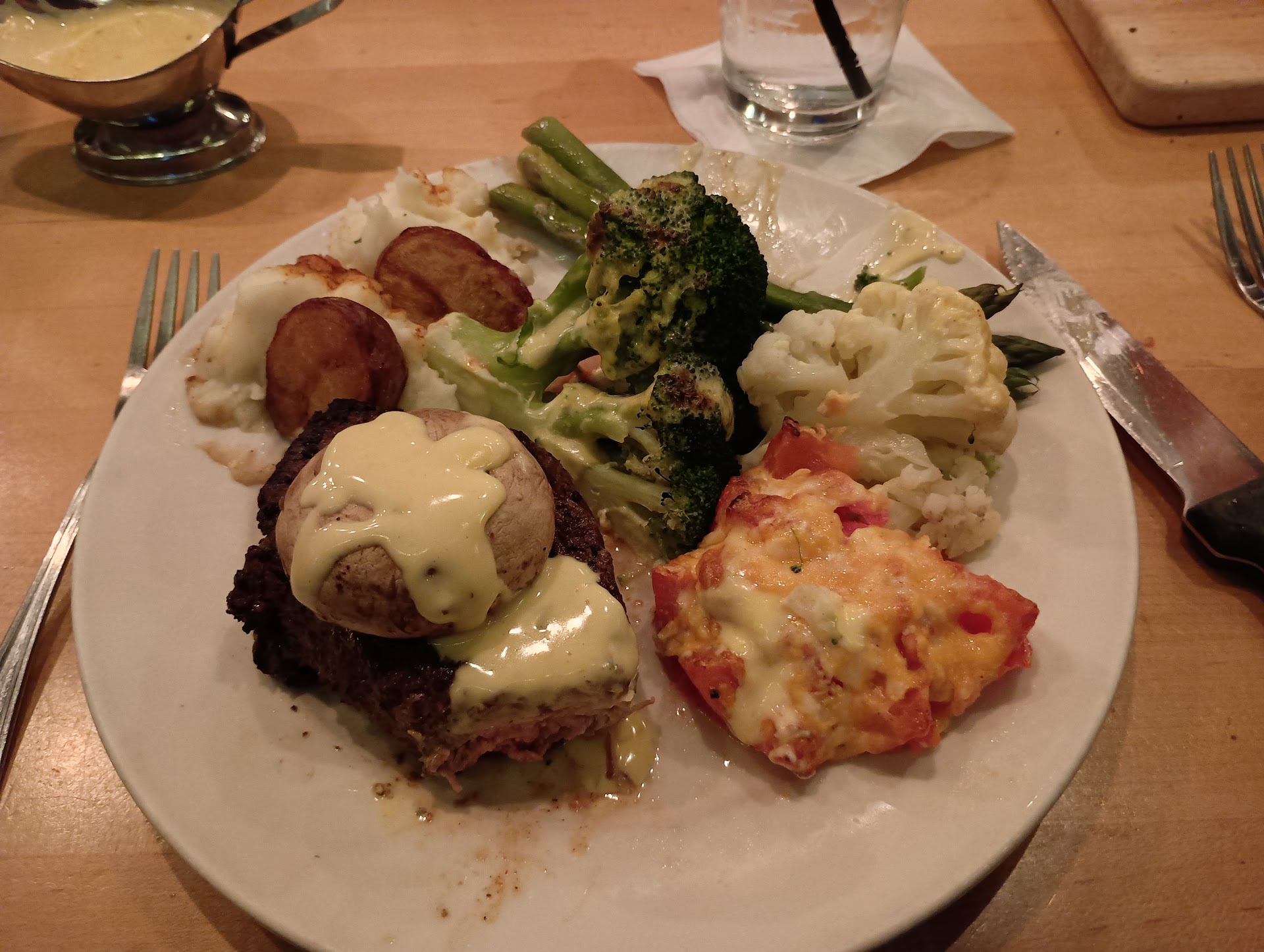 Now... I will say that both of our meals were slightly on the bland side, but they were cooked to perfection. The mashed potatoes were buttery, the steams redskin potatoes were cooked to perfection and gave away with the slightest effort. My wife's Ribeye was medium as requested, and my Prime Rib was a perfect medium rare. Just slightly bland, but there are pink Himalayan salt shakers, and peppercorn grinders on the table. Make use of the gravy that comes with the mashed potatoes, or use some butter, salt, and pepper to smooth things out a bit more. Use some salt, pepper, and butter to bring the redskin potatoes to the next level.