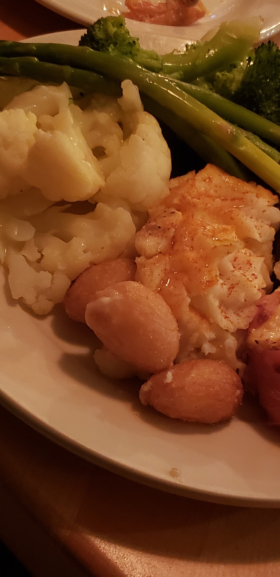 Now, for the main course, my wife ended up having the ribeye, with mashed potatoes, and I had the prime rib with the steamed red skins.