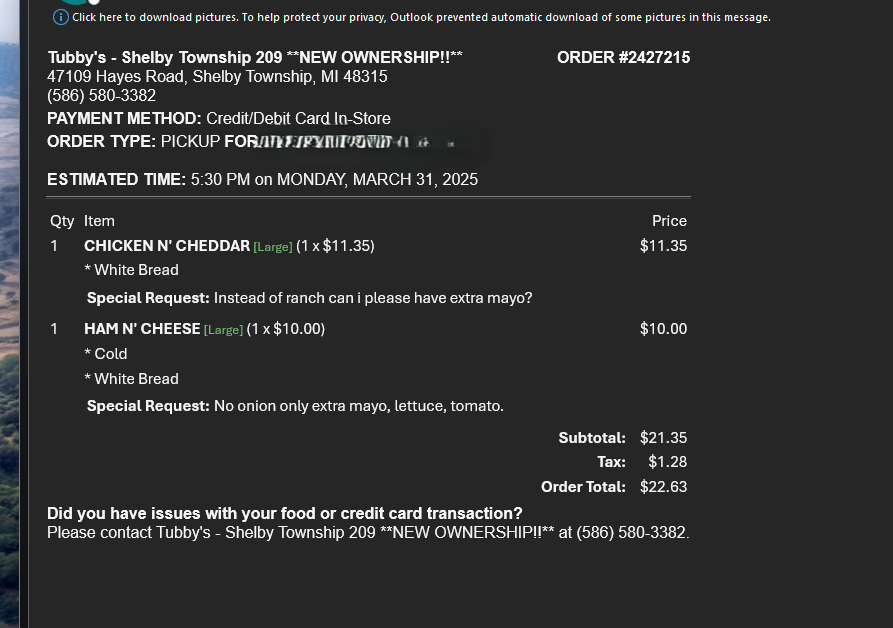 So just got subs for me and my family walk in place the order a very simple order two large subs one a Philly cheese steak with NO ONION and the next a chicken fajita with only meat cheese fajita sauce and green pepper very simple right mind you the owner and cook lady were arguing over what comes on the subs about MY subs anyways.. get home and both subs are LOADED with ONIONS the chicken fajita doesnât even come with onions so like what the hell⌠anyways I call up there and let the cook know she messed up BOTH subs and got offered to bring the incorrect food back for new food mind you itâs dinner we are hungry after working HARD jobs all day mind you I have little kids canât just up and leave again over there mistakes also I spent around $35 for the food.. she also offered 10% off next time I come in which is pathetic considering the food is already over priced and not even made right⌠anyways I would avoid this Tubbyâs...