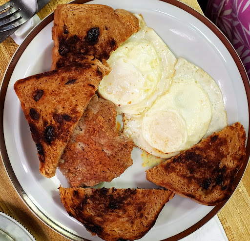 We tried the blueberry pancakes and they were very good also. The other order was the two eggs with sausage and toast. Eggs were perfect, raisin toast delicious, and the huge sausage patty was very good and had a lot of flavor.