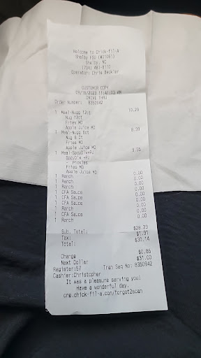 Read moreThis is the worst Chick-fil-A ever! We were in town for our son's wedding. We love Chick-fil-A and needed some quick, good meals. The first time we went to this location, I received a salad with blue cheese on it, even though I had requested no blue cheese. We had gotten into town late that night and ordered about a half an hour before they closed. When we got back to the hotel, I was disappointed to see blue cheese on my salad, which I which I cannot eat. It was too late to get dinner from somewhere else so a snack we had brought with us had to suffice for dinner that night. The second time we tried this location, we ordered two Chick-fil-A sandwiches and two drinks. We specified while ordering that we did not want meal deals/fries. When we received our order, we realized we had received and paid for fries! Guess we shouldn't have tried a third time, but time was short and we were hopeful. I once again ordered a Market Salad without Blue Cheese and with shredded Cheddar/Monterey Jack as a substitution. This location's employees, including the manager, refused to make the substitution, did not care about the other service issues we had encountered and spoke to my husband in a rude manner. Our Chick-fil-A encounters last week were disappointingly unique to all our other Chick-fil-A experiences. Other Chick-fil-As have made cheese substitutions with a smile and always striven for...