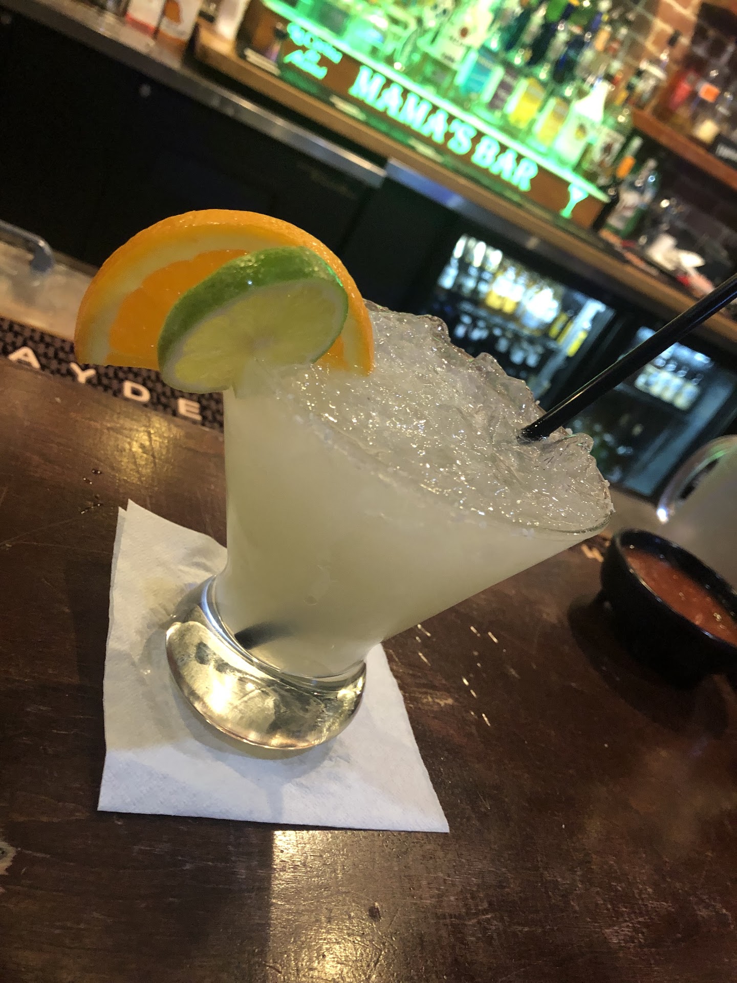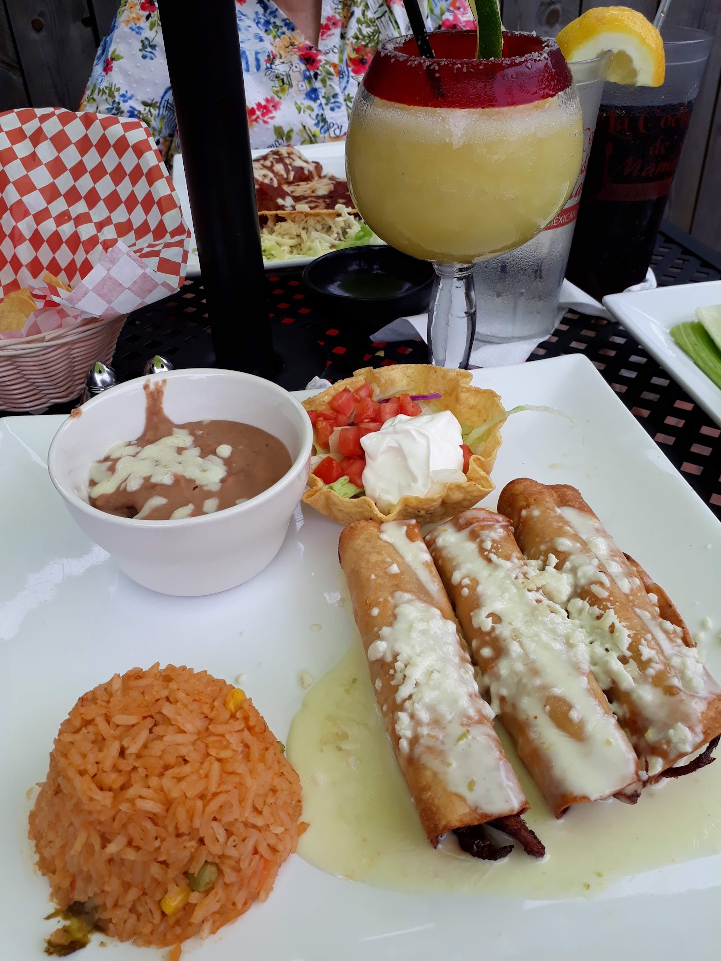 There are a lot of Mexican restaurants in Kentucky and 95% are not worth it. We were in the area and the reviews for La Cocina de Mama gave me hope. We went in with optism and it far exceeded our expectations. First thing you notice is the staff is all smiles, greeting us every time we walked by. It was a beautiful day with little humidity and as anyone knows lately that's been a blessing. We opted to sit in the patio area. They brought out the gratuitous warm chips and salsa. The salsa came in a carafe with small dipping bowls to pour it in. I don't like cilantro at all but the subtle taste of it and the hit of heat made me want to drink it. You can just tell it's made in house. They have an extensive list of tequilas and have 32oz frozen margaritas. I had a regular frozen margarita. This is the real deal. The tequila was smooth and dominant, worth every cent. We ordered Diablo wings for the appetizer. Decent size, fried and covered in sauce. I love heat! For the main we had the chicken flautas. Comes with rice and refried beans and three rolled up and fried Tortillas stuffed with chicken and topped with cheese. Great Mexican rice isn't sticky or mushy and this was cooked very well. They're on point with seasoning too. The refried beans were full of flavor and smooth. They didn't have a grainy texture at all. I really enjoyed them. Overall a great experience and can't wait to bring a crew to sit out...