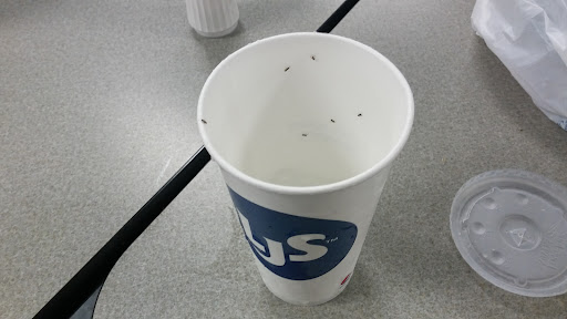 The order counter, beverage dispenser and condiment counter we're absolutely clean and organized. The trash recepticles we're clean and not over full. The dining room and tables were spotless.