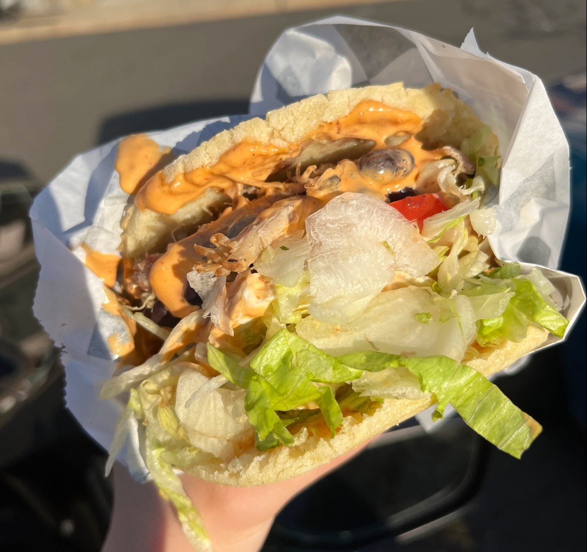 I had an arepa with beef and did add garlic aioli to it...it was very good except that the items in it are layered. Maybe mixing the items a little or putting sauce inside the arepa first will help blend the items more and get good bites of food all around. I got to the end of it and only had rice and arepa near 2nd half...very very bland.