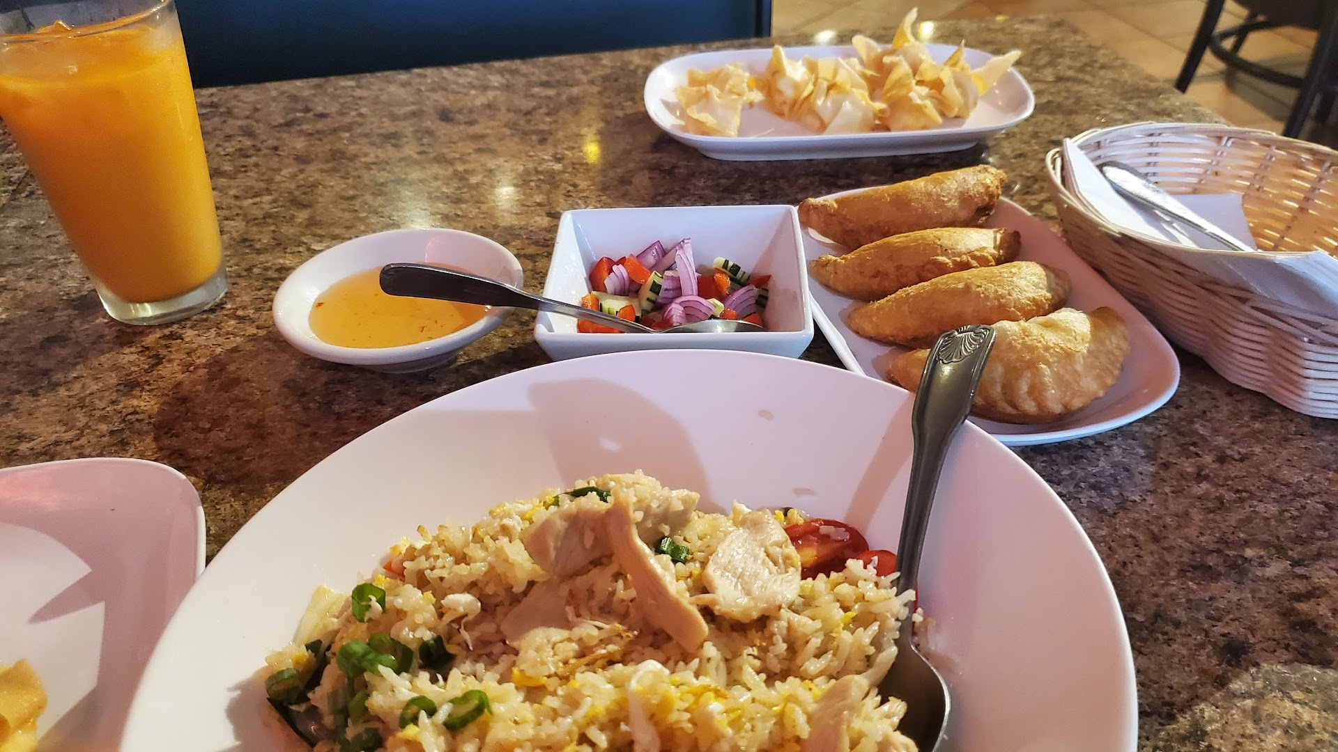 I highly recommend the Thai tea, ANY of the entrees (they are all delicious), and most importantly, the crab rangoons and curry puffs.