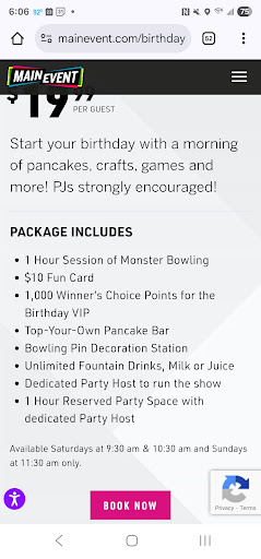 This years party: Again, communication for booking was amazing. Food was good and the pancakes still a hit. I requested juice and milk, but our host said milk wasn't an option. He checked twice and said they didn't have it. Provided one pitcher of apple juice for 10 kids. 8 kids were able to have half of a cup of juice to drink and a refill was not offered. Entertainment: the host put a pile of the pins to be decorated on a table where we bowl and walked away. We couldn't find him for shoes, so parents were lining up at the couner to get shoes, so we had to skip decorating pins, so we had time to bowl. He finally arrived after we requested him from another staff, and he provided 3 pairs of shoes. He didn't set up monster bowling and had regular bowling. We had to find a manger to set up the kids bowling and one lane ended up only having bumpers. We had to cut bowling short, so they had time to use the arcade cards. I had to go to the front desk to request him again because we never received our arcade cards. He never provided us with the VIP pass scavenger hunt for our son, but made sure to bring a bill. It was frustrating that this time wasn't as smooth since I had our 4 month old baby with us this time. I should've requested a more experienced host. The managers went above and beyond to try to make the rest of the party better. They were very sweet, and the managers have been excellent both times we've visited. Recommendation: I recommend the brunch bowling, it's a hit with 6-8 year olds. Request an experienced host and know they stick to a strict time table. There is zero room for adults and the only seating is for children. There isn't a place to set gifts or desserts or your supplies or sit down. I brought a box each time and put everything in it and under the pancake table. There is zero space for anything on the food table except what they provide. Request an extra serving table, but know that it infringes on the other parties space. If something does go wrong request a manager because all the managers have been amazing. Do not have Bryce as your host unless you have a small party and prefer to do things yourself. He needs more training before hosting on...