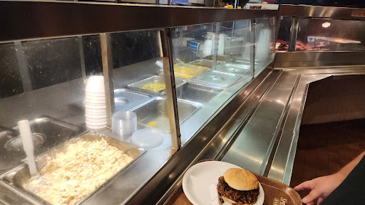 After you walk on in, get in line and grab a tray as you decide on your delicious BBQ dinner. I tried the Black Pepper Sausage and Ribs with a side of their secret barbeque sauce - the perfect blend of sweetness and spice! The friendly staff freshly cuts the meats of your choice, pours on the sauce (or served the side) and a hot fresh roll. Next, you are free to pile up your plate - it's self serve from here - with sides like Mac N Cheese, Baked Beans, and Cole Slaw. Mmmm! When you arrive at the cashier, select a drink like root beer served in an icy cold mug - just exactly what I like to wash my meal down with!