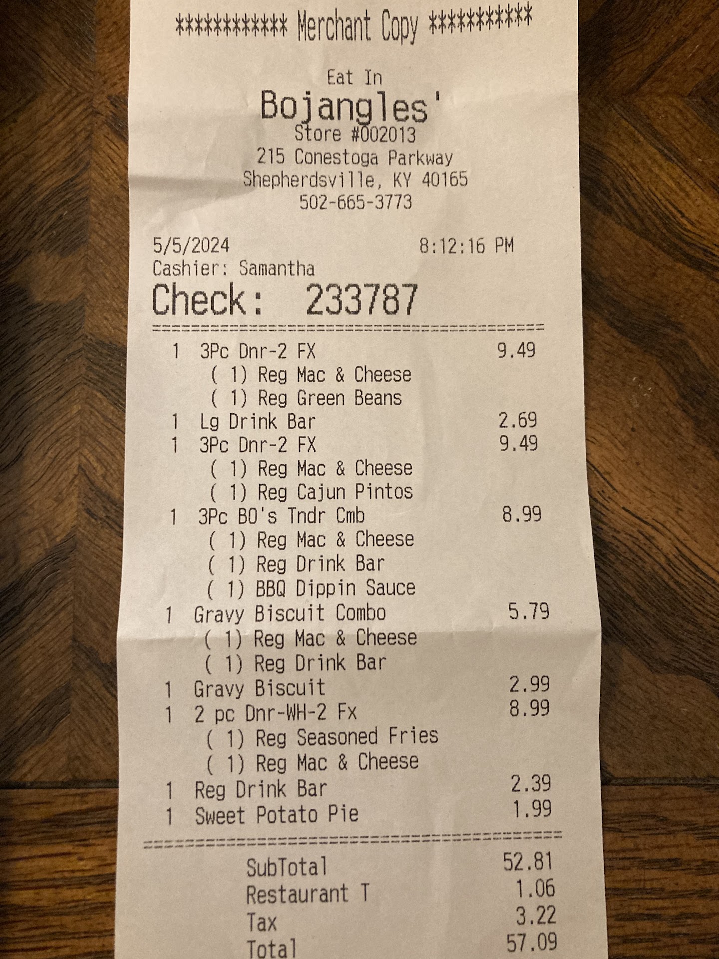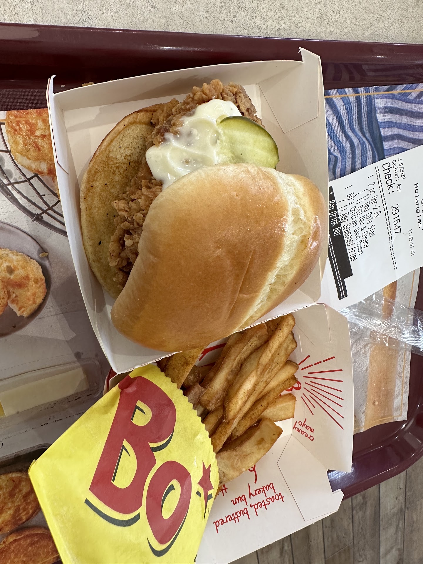 Read moreOur first time at a Bojangles restaurant, and we were more than pleasantly surprised, and left wishing they would start opening these in the northern states too. This was so good! The seasoning on the chicken and fries are amazing and the fried chicken had that great crunch on the outside and the juiciness on the inside that other fast food places cannot do right. I had the chicken sandwich. It was a little boring looking, only having pickle and mayo, but the taste still came through and let the chicken shine. I think it could be good with lettuce or maybe tomato too, but it doesn’t need it. The seasons they use on the fries is so good. I’m not sure if it’s the same as for the chicken but they’re both seasoned perfectly. My fries did seem a little dry, maybe not totally fresh, but the taste made up for it. The young man at the register was great, we visited April 8, didn’t get his name though. He gave us the tray of food and said he gave us a side of potatoes. It must have been an extra one or something, but that’s pretty awesome and really made our visit perfect. The coleslaw and potatoes and gravy were excellent as was the sweet tea. They make fresh biscuits every twenty minutes, and they were good. I really have nothing bad to say except that now we want to eat there again and we don’t have any in any of the states even close to us. One of the best fast food restaurants we’ve been to, and the best chicken fast food...