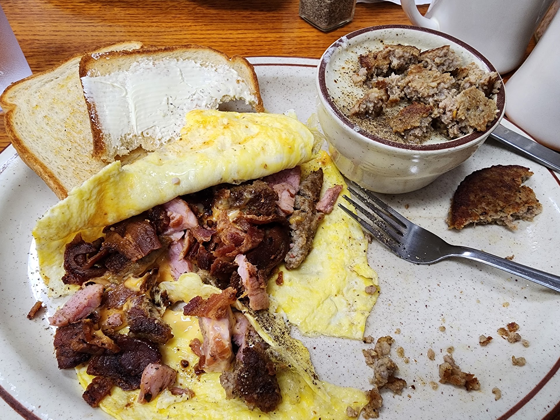 Ā Ā Ā Read moreOrdered a vegetable omelette. When I took my fourth bite, I got a piece of plastic in my mouth and halfway down my throat. After I coughed it back up & determined it was a piece of plastic. I sent the Dish back and asked them to take it off my ticket as Iād also only take four bite. The owner said, loud enough from the kitchen for me to hear, āItās an onion peel. Ask him if he wants something else, but heās paying for it.ā I KNOW the difference between an onion peel & plastic.