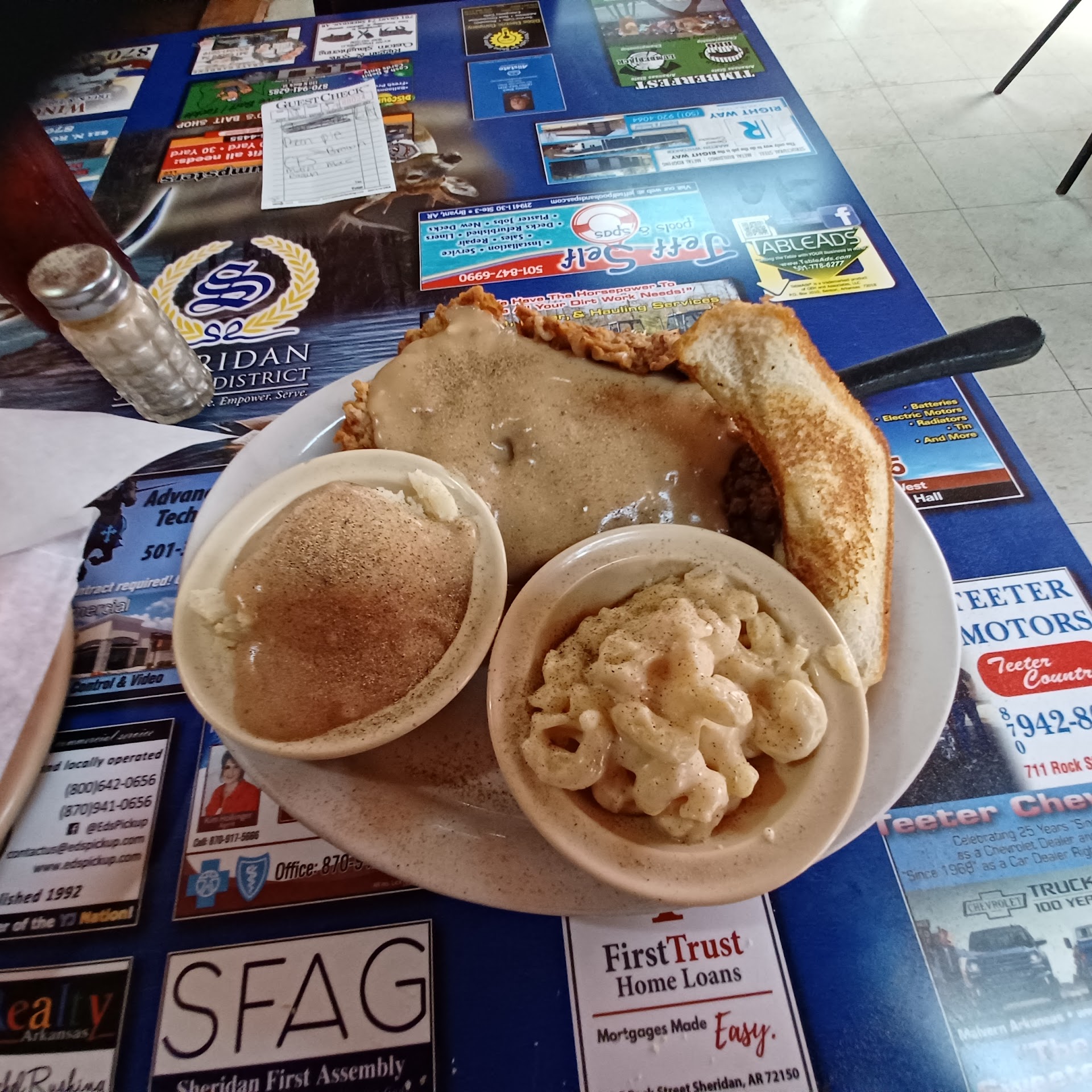Great restaurant! I ordered Lilly pops as an appetizer, very unique and worth experiencing, buy be careful, they are extremely hot. For dinner I went with a southern classic, chicken fried steak, but with brown gravy, mashed potatoes, and macaroni and cheese. The chicken fried steak was cooked perfectly!!! It melted in my mouth and you can tell by the batter it was made there and not some frozen patty. The mashed potatoes were made from scratch and comes with the peel mashed in. Even the macaroni and cheese was made with love. Creamy goodness!! It also came with a slice if Texas toast, perfect for getting the gravy left on ny plate. Finally I finished it with a slice of pecan pie. You bet I will be going back here again. I love finding the hidden treasures on side road small towns. There is plenty of seating in the place, it has 2 floors. I was completely miserable when I left. I had a hour drive home, overstuffed belly and just wanted to take a nap. So be warned ⚠️ it is so good that you will over indulge. The wait staff was very friendly, knowledgeable and tentative. My glass was never empty food was hot fresh and...
