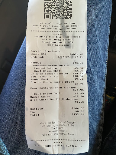 Read moreFirst of all this is a review for the Sheridan, Wyoming location. Found this place on Google as one of the better places to eat in Sheridan. Checking the photos it gives you an impression that it's going to be somewhat a fine dining experience. Upon entering the establishment I realized that this was not the case at all, but thought well it's not the place but the food and service. So upon entering no one was in the front to greet or sit anyone. I waited a few minutes and clearly some available staff were just passing by or ignoring the fact that someone was at the front, one down. Finally I got seated and the whole water and menu came in about 10 mins later, 2 down. Ordered the hand cut ribeye at $32 got mushroom soup , loaded mashed potatoes, and asparagus. Keep in mind the mash and asparagus were on the signature and premium sides section. First the mushroom soup came, it was watery and mushrooms shriveled and lifeless. This looked like it was dumped out of the cheapest mushroom soup can and served on a tiny bowl, also was too salty. The steak came next, it was nothing of what the pictures show, the mushrooms on it didn't look fresh nor did they taste like it was. The steak, well it tasted like my buddy's cooking who didn't know how to cook steak, hardly warranted the price posted on the menu. No crust nor grill marks on it. The mash potatoes were plain and not even warm. The only thing that was done well was the soda and the asparagus. Now I'm not saying one should avoid this place but for what it was made out to be and the prices, it really falls short, 3 down. If you're looking for decent food that'll make you say wow and with decent prices, this is...