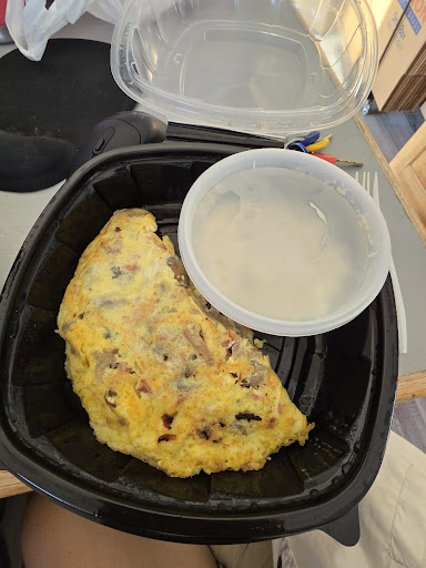 My eggs that appeared to be dry and way over cooked sat on a dirty plate that had some brownish and red something on it (looks like it wasn't even washed) that I could rub away so it wasn't something that was just stained into the plate. . .plus the eggs tasted rubbery and had absolutely no flavor. . .you could tell they were liquid eggs.