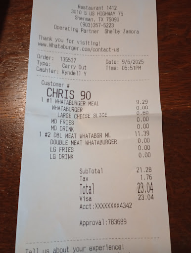 Read moreI was very happy to see a location in Sherman closed to where I live. However I have been very disappointed. The food has been good but service is sorely lacking. I've been there 5 times and this is the summary of my visits. Visit 1: Shorted 4 taquitos in my order. I didn't take it back because it was very late at night and I was too tired. Visit 2: Cheese on my burger. I HATE cheese on burgers so I threw it away. Visit 3: I got a Whataburger combo 1. I explicitly told them NO CHEESE. Guess what? I got cheese. Visit 4: Rinse and repeat, there was cheese on my burger again. This time even though it was after midnight and I was very tired, I drove back and insisted I get a burger without cheese. This brings me to today. Visit 5: I ordered a #1 combo with cheese Whatasized with tea, a #2 combo no cheese Whatasized with coke, a #13 combo with a medium Dr Pepper and 3 apple pies. I checked before I left and there wasn't cheese on my burger but no apple pies in the sack so I had to park and go inside to get my ordered corrected. After arriving home I found out the fries were not Whatasized as I had paid for according to the receipt. Why do I bother with the drive in if I have to get out and go it to get the order fixed?? It this a training issue, a management issue or a "I have a bad attitude"...