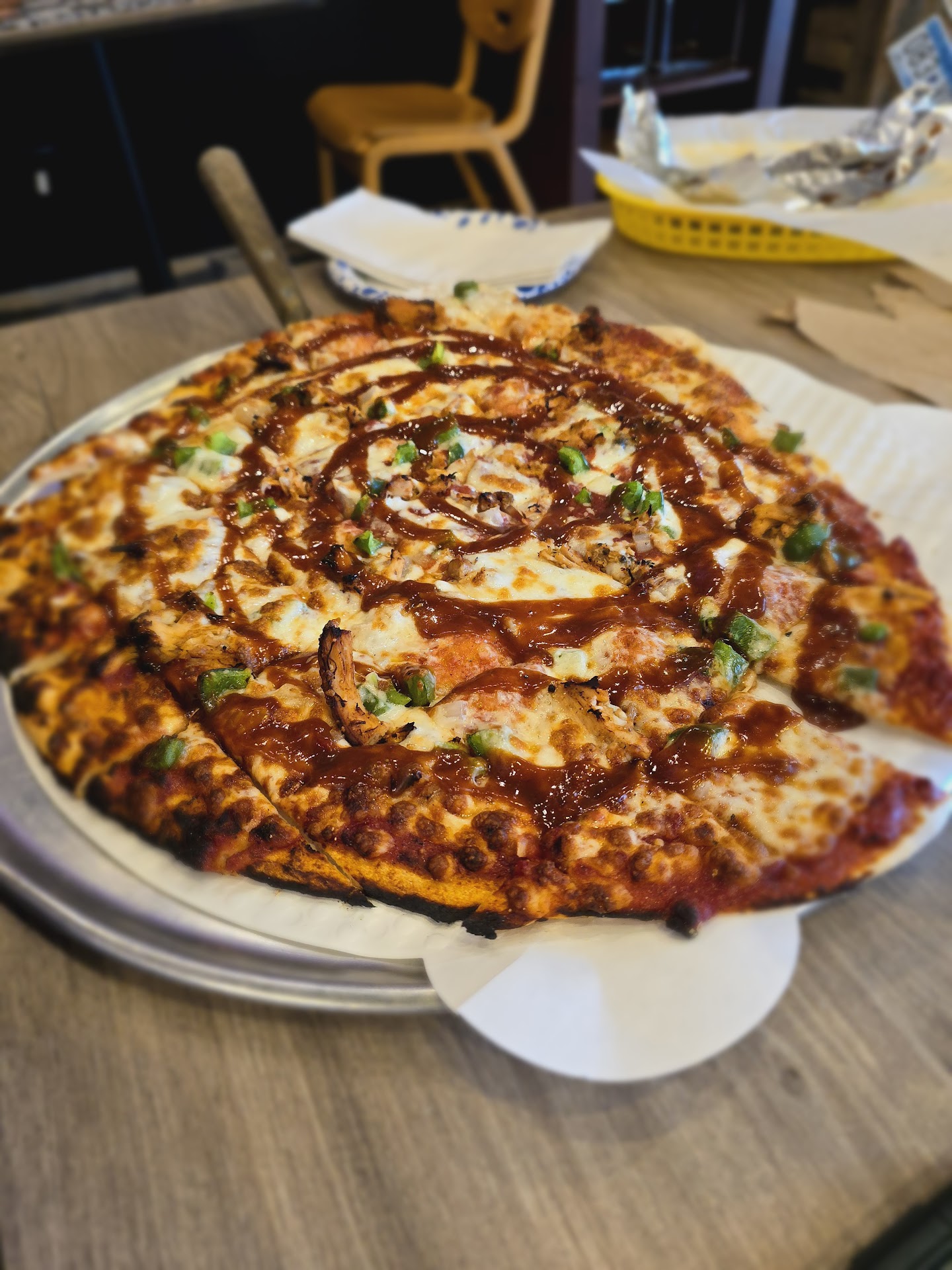 As for the pizza itself, the crust was thin and crisp, the pizza sauce wasn't overpowering, and the toppings and bbq sauce were exquisite. For me, any one of these factors could make or break a pizza. I have to say, the crust itself puts this as a serious contender for best thin crust pizza in the Appleton area. I'd even put it up against the old Frank's pizza palace downtown or Sammy's pizza in Neenah. That bbq sauce is not too sweet, it has the right tangy flavor, and it is quite delicious. The chicken on the pizza was pretty good, too, and the green peppers added a delightful freshness. The shape of the pizza needs a little help as it's not quite round, but that just adds to the charm. I would be very curious how one of the non-bbq pizzas would taste, and I'm looking forward to trying that sometime soon.