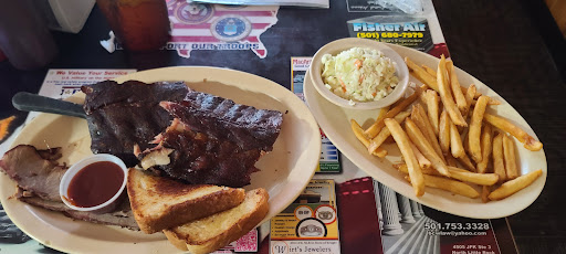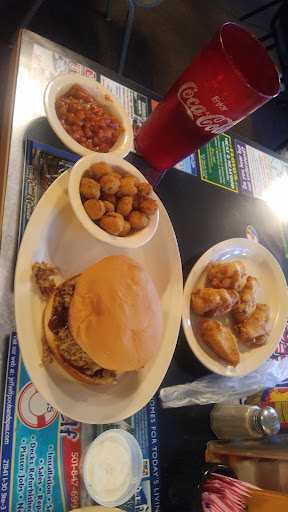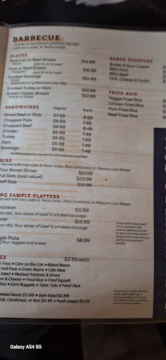 Read moreThe barbecue sandwiches are fairly tasty. Large chunks of pork, with or without slaw and saucy. They also offered several sizes of catfish plates. Or you can browse the menu, and order off of that. The menu lists appetizers to sample while your food is cooking. As well as the daily lunch specials that they also served. The lunch specials are typical of a regular cafe, served hot on a plate lunch, served either with a meat or as a veggie plate with either regular or jalapeno cornbread! They also offered an array different sandwiches from hamburgers, tuna salad, and others if you just want a sandwich. The large, thick onion rings certainly looked good on a fellow diners plate! I enjoyed my veggie plate of green beans, corn on the cob, fried okra, mashed potatoes and gravy and a regular cornbread muffin. Now, all the food was under seasoned-- lacking flavor from salt, pepper, or any other seasonings. But I persevered with pepper! They could season with mixed seasoning blends, bacon, butter and even a little sugar and salt! But---- OMG---- Be SURE to leave room in your tummy for DESSERT!!!! We both got the BlackBerry Cobbler!!! Tears came into my eyes as I dug in to the hot, juicy delight that tasted just like my mom's did!! My husband had his topped with vanilla ice cream, melting down among the berries. I ate my cobbler just the way we usually ate it--- no toppings!! The cobbler was so awesome! I am SO glad that I ordered it! I usually don't order dessert. I may go back for just a bowl of cobbler and a glass of iced tea. There was plenty of local folks coming in while we were there, and most seemed to order the catfish platters, so might start there! The wait staff are all "Y'all come back!" friendly and attentive...