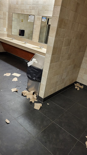 Can't speak for the women's but the men's restroom always look like a barfight just went down... or that the young males of the species regress to Neanderthals when confronted with a lavatory. ...