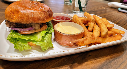 Read moreLove that this Marriott had a restaurant in their hotel. Although a limited menu and only serving breakfast and dinner.. for us that was ok. Casual and modern decor. Tables and booths and seating at the bar. Full service bar. Outdoor seating at a firepit that is available as well. There was lounge seating on the other side of the gas fireplace. Servers were friendly and Amber especially was very attentive to our party of 7. I had the salmon and broccoli and it was done perfectly. The Bistro Burger was large,quality beef, on a brioche bun and done perfectly. It came with French fries,served hot. The grilled cheese my granddaughter ordered had plenty of cheese. Although they have a 3 cheese one,she only ordered American Cheese. The Bistro Burger looked so good, we went back a 2nd time and I ordered it plain. Again, a really good...